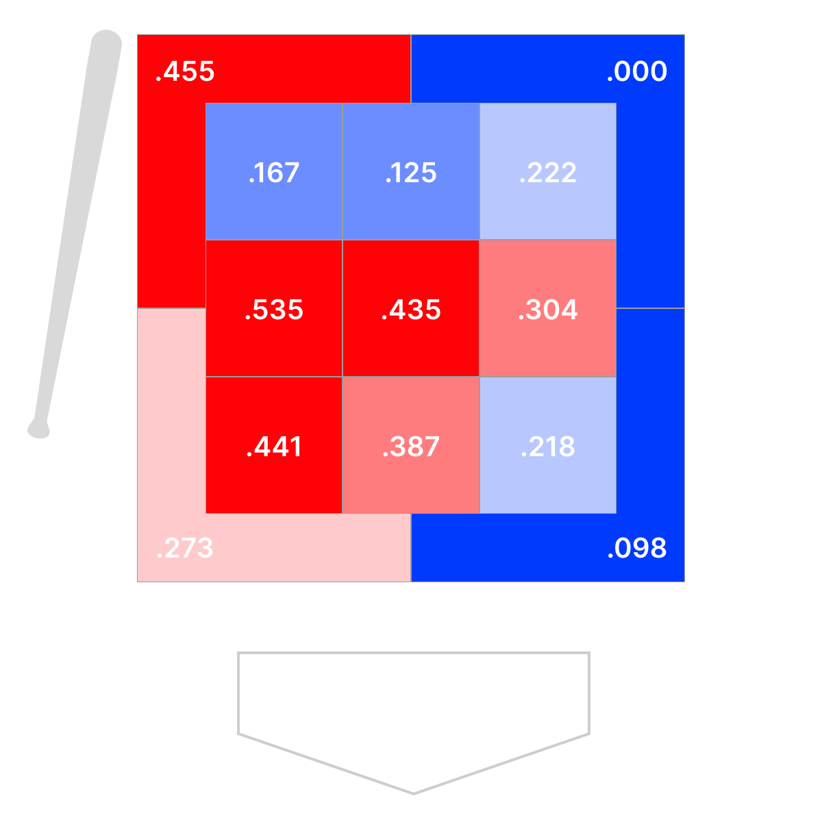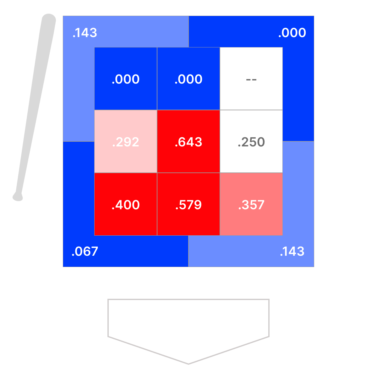 - 0ストライク、1ストライクの成績が突出(0ストライクは打率 .469・OPS 1.651、1ストライクは打率 .452・OPS 1.481)。