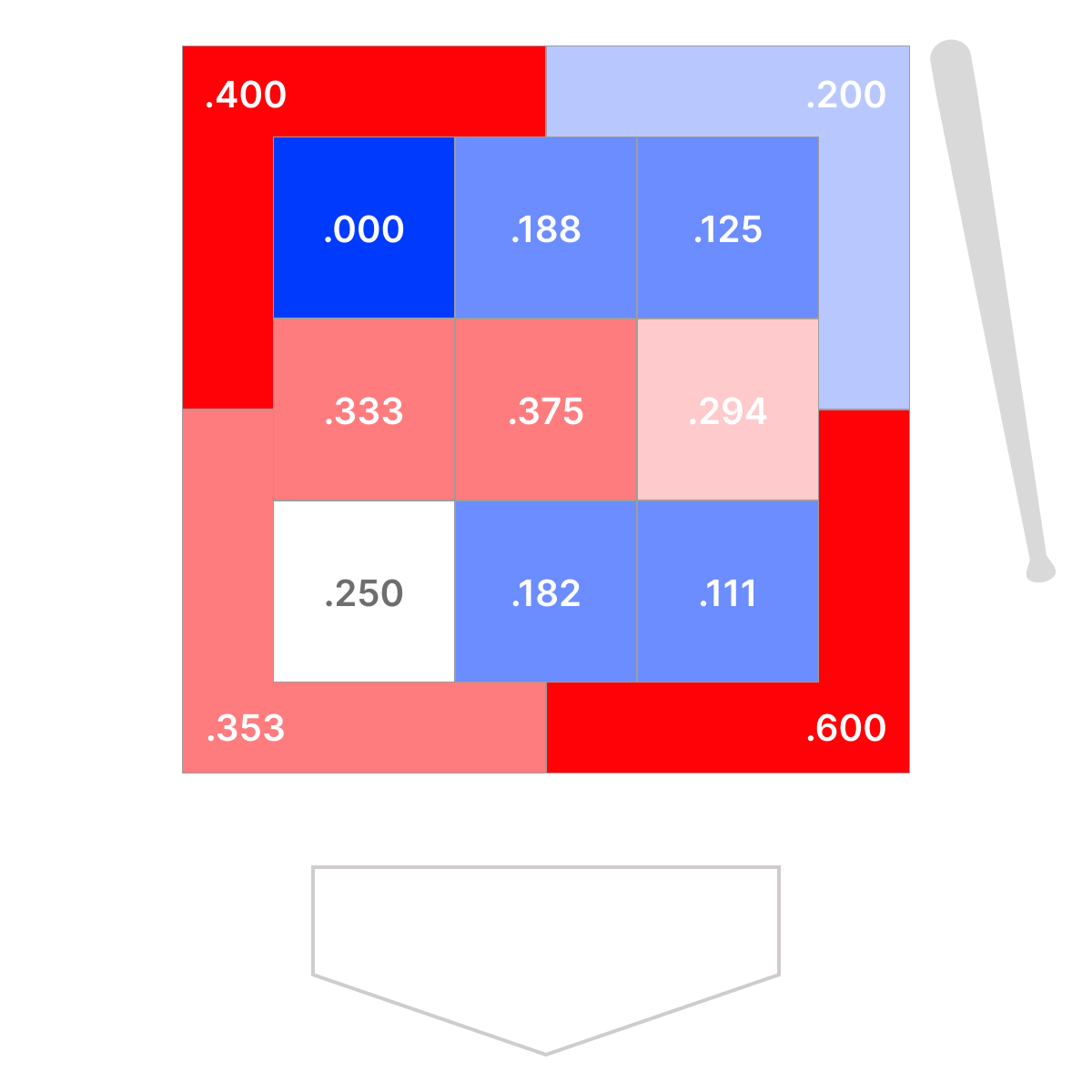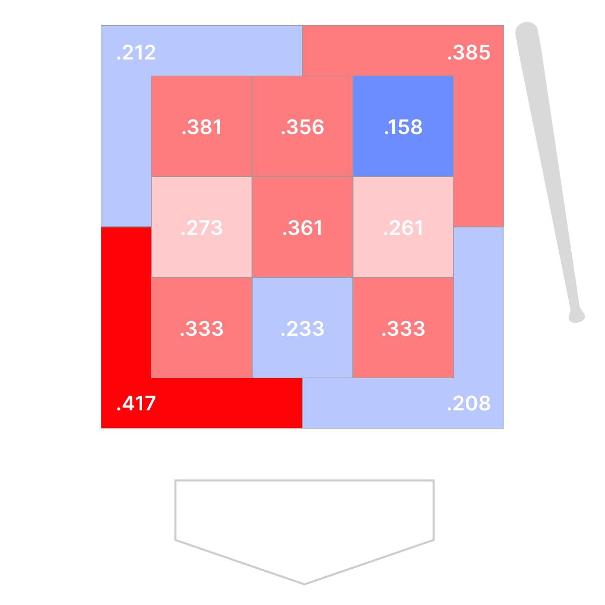 またアウトコース低めのボールゾーン(.353)やインコース低めのボールゾーン(.600)で高い打率を残しているのは、コンタクト能力の高さを示しています。
