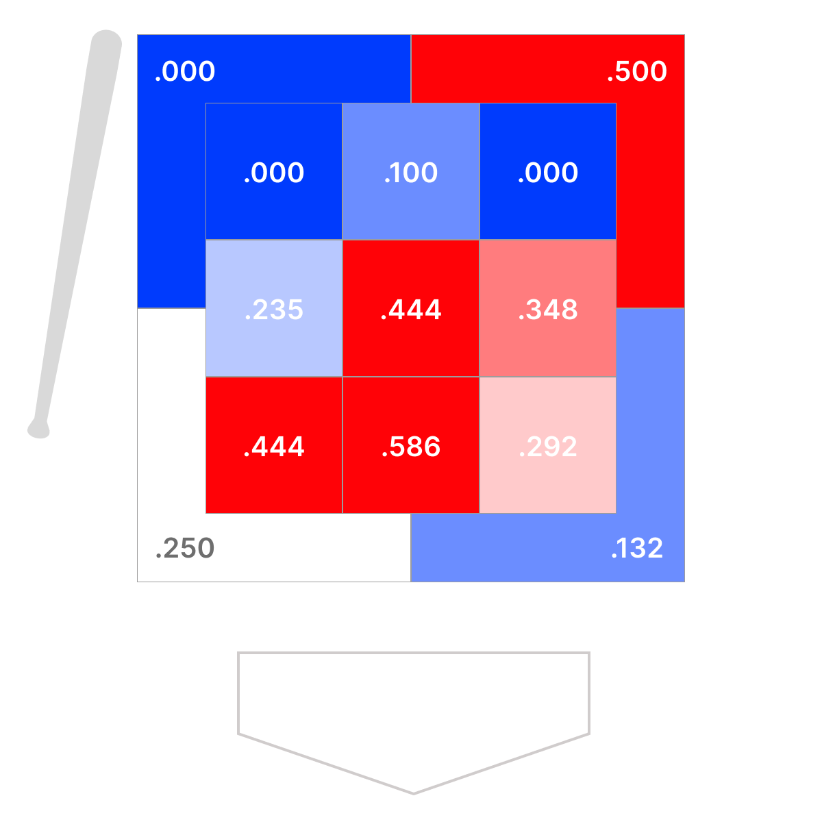 一方で、高めのコースは全般的に打率が低く、インコース高め(.000)、真ん中高め(.100)、アウトコース高め(.000)とほぼ抑え込まれています。外角低めのボールゾーン(.132)も比較的安全なエリアです。